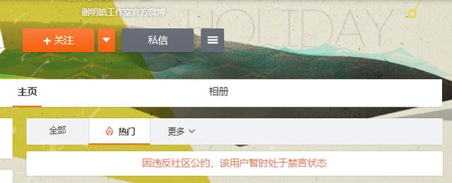 值得注意的是这些微博都是谢明皓工作室微博发的,他本人的账号并没有相关内容的发布,虽然他不是非常出名但微博也有380多万的粉丝,但其工作室只有90多万粉丝;其次是工作室的微博因为违反微博公约而处于禁言状态。