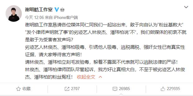 2日中午,谢明皓工作室又通过微博发表一篇“敢言信”提出三点声明:一请求两人接受官方毒检;二主动交代犯罪事实;三如果二人没有犯罪行为,将承担法律责任。同时他还指出,已接受多家媒体的专访,掌握真实性证据。随后又发出微博称他们的律师团队尽管起诉,好让真相大白。