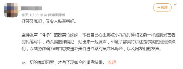 而且最后的关键转折点还在于吴亦凡的妈妈,都美竹都还没报警,竟然是吴亦凡的妈妈先一步报警,说有人讹诈她儿子。结果警察叔叔们一调查,嚯,进去吧你~