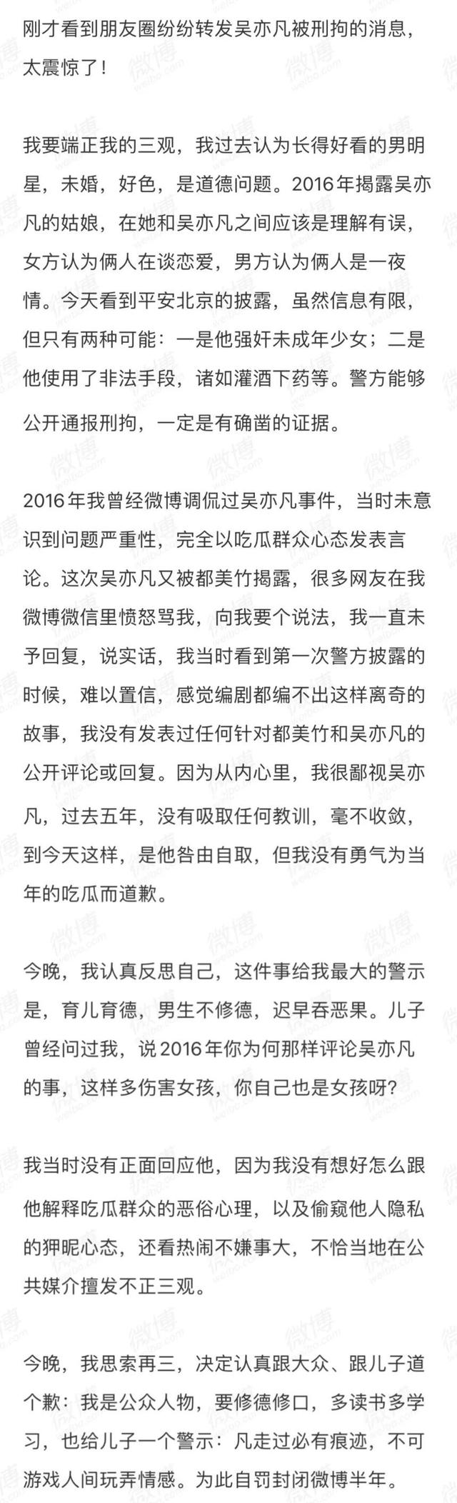 现在看到吴亦凡被刑拘的消息大为震惊,才意识到身为公众人物要为自己的言论负责。为此她向公众道歉,并自罚封闭微博半年。
