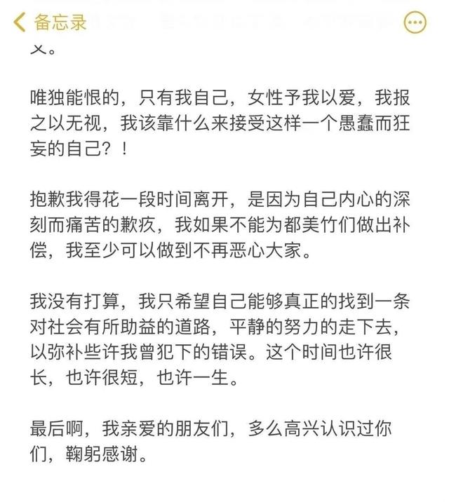 她在被禁言前发过一则道歉的小作文,表示自己当年纯粹是吃瓜心理,没有意识到问题的严重性。