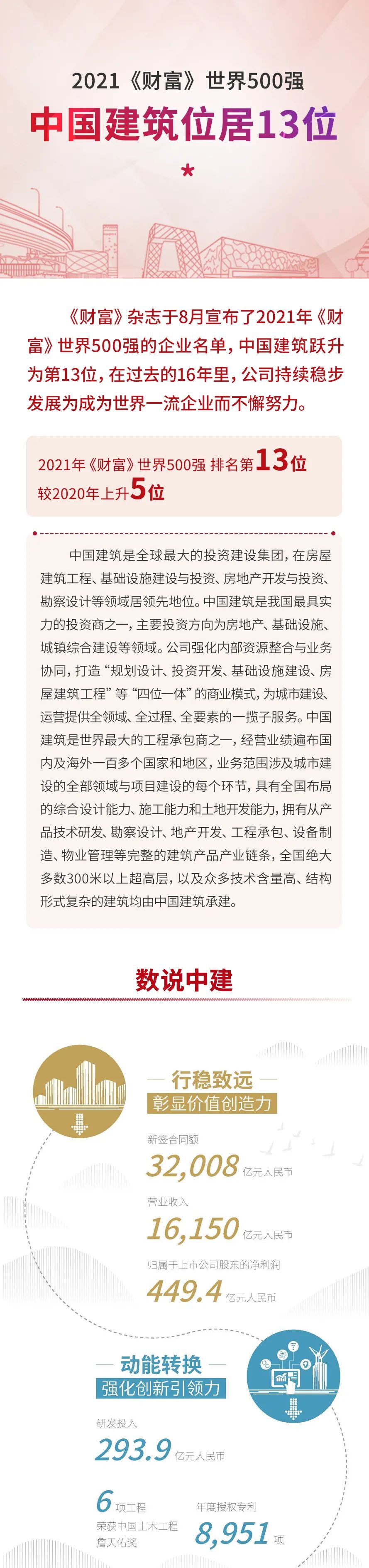 【摘要】 刚刚!《财富》世界500强排行榜2021年榜单正式公布中国建筑跃升至第 13 位!连续16年中国建筑世界500强排名稳步增长为创建世界一流企业持