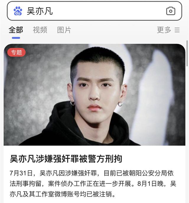 【摘要】 “吴亦凡”正在以最快的速度在全网消失。微博,炸号了↓工作室,被封了↓超话,关闭了↓、Q音、网易云连人带歌,下架了↓百度搜名字,出来