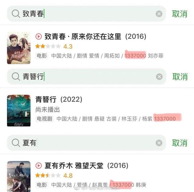 他参演的所有影视剧集,名字变成了一串代号↓