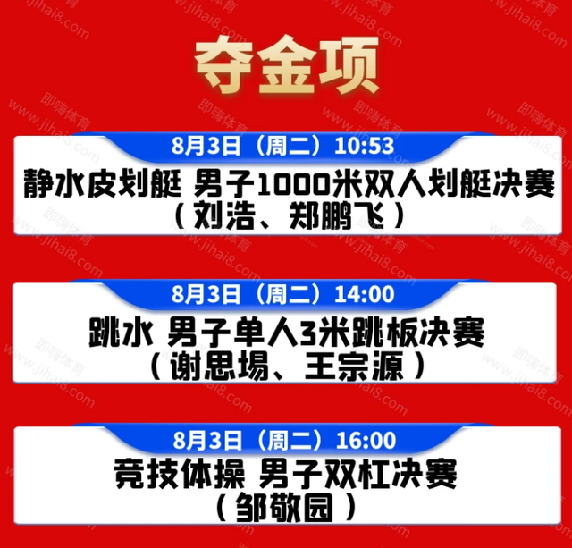 北京时间8月3日,东京奥运会来到第11个比赛日,今天将产生26枚金牌,中国军团预计在跳水,体操,皮划艇项目冲击金牌,而在田径等项目上有争夺奖牌的希望。