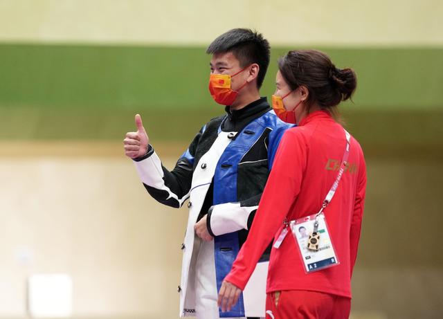 新华社照片,东京,2021年8月2日 (东京奥运会)(15)射击——男子50米步枪三姿决赛:中国选手张常鸿夺冠 8月2日,中国选手张常鸿(左)赛后庆祝胜利。 当日,在东京奥运会射击男子50米步枪三姿决赛中,中国选手张常鸿夺冠。 新华社记者 鞠焕宗 摄