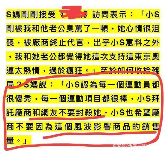 她说,她和小S的老公许雅钧已经第一时间批评了小S,让她今后不要再那么口无遮拦。庆祝好友拿奖牌的心情固然很好,但也不能太过忘形。小S通过妈妈发声,拜托网友和商家品牌不要封杀她。