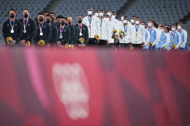 7月28日,斐济队球员(中)、新西兰队(左)和阿根廷队在颁奖台上。新华社记者薛玉斌摄