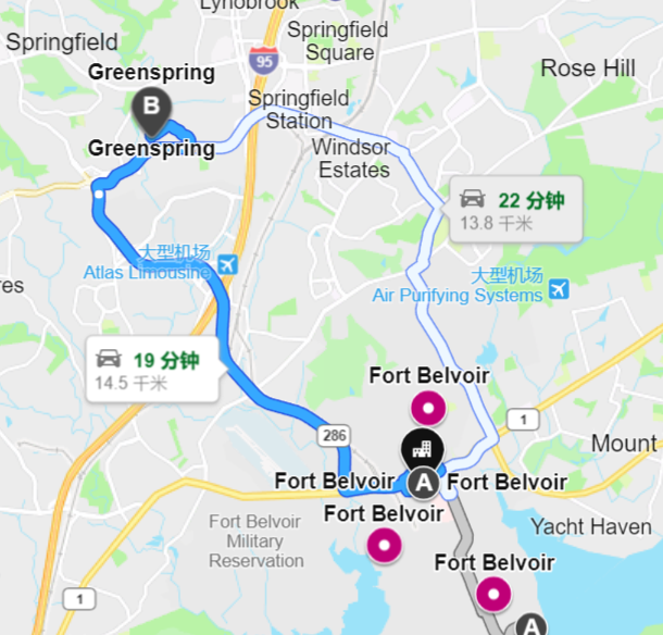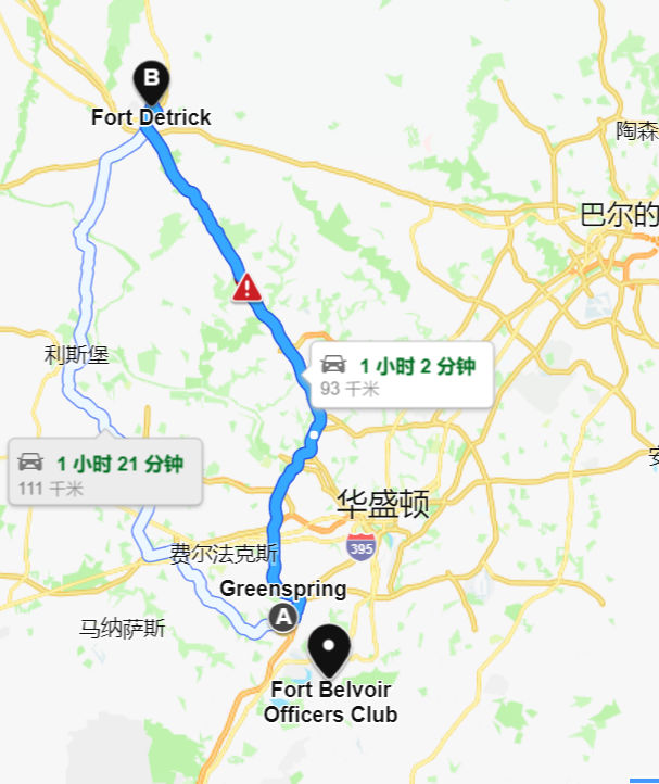 而从地图上看,贝纳西工作的贝尔佛阿堡军事基地距离德特里克堡只有1个多小时的车程。距离曾暴发不明呼吸系统疫情的格林斯普林养老社区更只有不到20分钟的车程。这些地点是否会有某些交集?