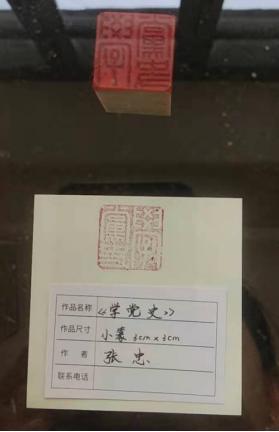 个人简介:张忠,字大有,1961年生人,淄博人,2017年定居威海。威海市文化交流协会会员、威海市环翠区书法协会会员、曾任尼山书院篆刻老师。从事篆刻、传统雕版印刷工作40余年,2018年应邀参加中韩文博会其个人一百余幅篆刻作品参展、2019年应邀参加威海国际艺术博览会、个人创作作品在2019年威海摄影集团拍摄"方寸之间一片天"篆刻作品集中进行出版、2018年12月于威海市图书馆新馆举办《纪念主席诞辰125周年》篆刻作品展、2020年参加了威海摄影集团拍摄《印象景瓷》宣传片、2021年获"永远跟党走"环翠区书法篆刻作品展优秀篆刻作品奖,2021年个人34件篆刻作品视频在威海市、山东省、中央宣传部"学习强国"平台展播,率高达400余万次。