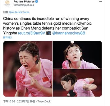 路透社在报道陈梦夺冠的时候,选的三张配图也“很花心思”,专门挑了她在打乒乓球时的专注表情,不是闭着眼睛就是眯着眼睛。