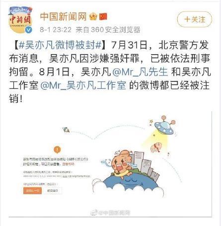 据报道,7月31日,顶流明星吴亦凡因涉嫌强奸罪,已被依法刑事拘留。8月1日,吴亦凡个人微博账号和工作室账号已被注销。