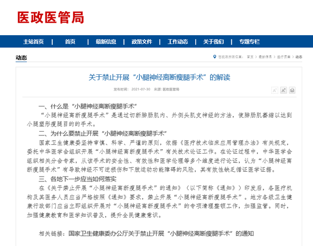 ●7月30日,国家卫健委发布《关于禁止开展“小腿神经离断瘦腿手术”的通知》,明确“小腿神经离断瘦腿手术”缺乏科学依据和循证医学证据,直接导致神经不可逆损伤和下肢运动功能障碍,存在严重安全性问题,有悖于医学伦理原则,禁止该手术应用于临床,并要求地方各级卫生健康行政部门立即组织开展对该手术项目的专项清理整顿。(来源:国家卫健委官网)