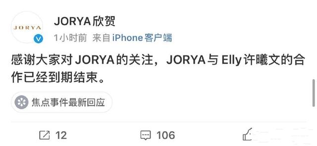 除了小s受到很大的影响之外,小s的女儿Elly许曦文也受到了影响,据悉JORYA这个品牌方也表示与小S的女儿Elly许曦文的合作已经到期结束。看来这就是报应,虽然小s目前还没有回应和道歉,但是非常有正能量的品牌方已经开始行动,不要认为自己多厉害,娱乐圈明星多的是,缺小s你一个也影响不了什么。