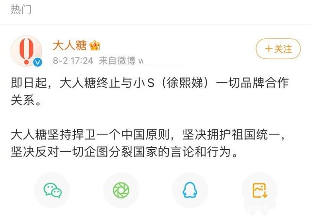 截止到目前为止小s在自己的社交平台发布一些不当言论已经受到了很大的影响,已经有三家品牌方与小s终止合作,其中有清扬、寿全斋、大人堂这三家公司已经官宣与小S终止一切品牌合作关系,大家知道后也是感觉他们做得对,认为小s确实没有自己的底线,不支持内地的奥运健儿也就算了,还故意整这一套令人非常气愤。