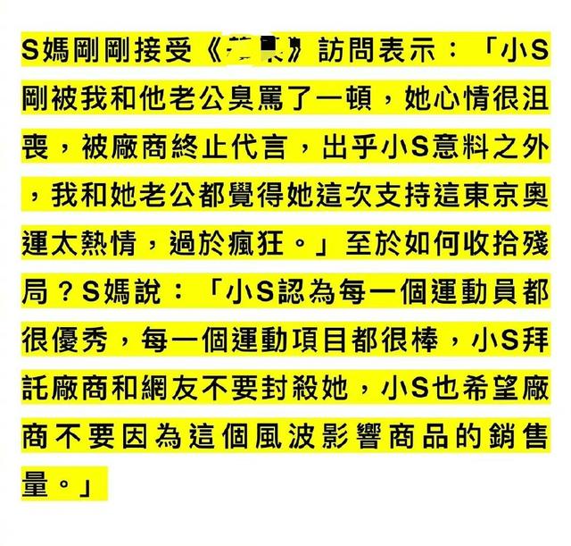 不过令人非常奇怪的是发生这样的事情小s不第一时间出来道歉,在接受记者采访的时候还表示,先让她静一静。这简直是太搞笑了,还先静静,难道还没有意识到自己的错误吗?小s这样回应也太不靠谱了,不过小s的妈妈倒是很有先见之明,还出面回应说目前小S的心情很沮丧,她和小s的老公把她骂了一顿,其实她认为每一个运动员都很优秀。希望品牌方和网友不要封杀她。