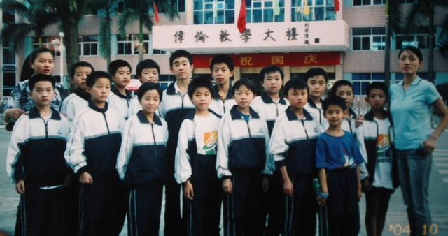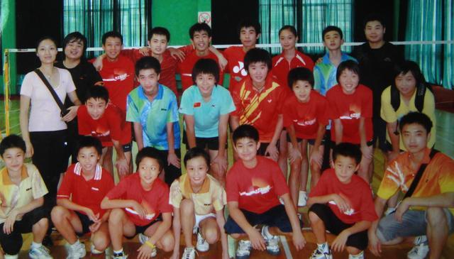 (2004年,贾一凡(第一排左四)在羽校与教练、队友合影。)