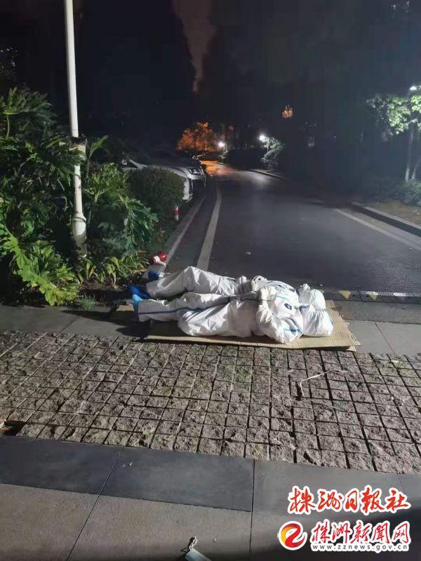 三医院的护士何露浩和李晶莹,连续12个小时为居民做核酸检测,疲倦了,就把纸板放在地上,躺着休息会。