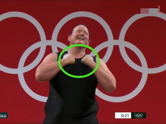 于是,哈伯德的第三次试举开始了,这一次她依旧选择挑战125公斤。令人遗憾的是,哈伯德的第三次试举几乎是第一次试举的翻版。最终,三次抓举全失败的哈伯德只能接受被淘汰的命运。这时候,有趣的一幕发生了,只见哈伯德先是用双手锤了一下胸口,随后面向观众比划出了一个心形,仿佛是一位娇羞的女子。