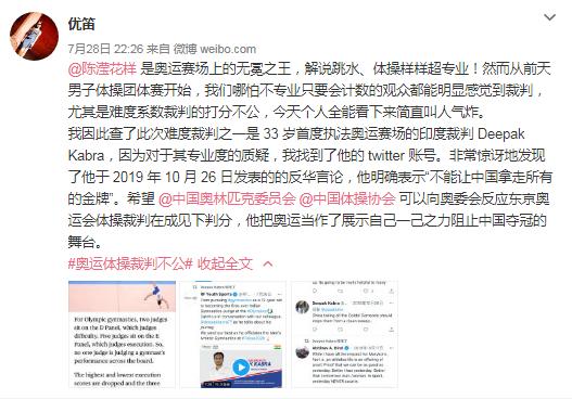 早在奥运会举办前(2019年),印度裁判迪帕克·卡布拉曾在推特上这样写道:“中国包揽了所有金牌!应该有人阻止他们大获全胜。”已经开始预谋怎么黑掉中国体操队努力。这种裁判员主观思想就有错误的人,执行打分时说客观打分,你是欺骗世界人民智商么?