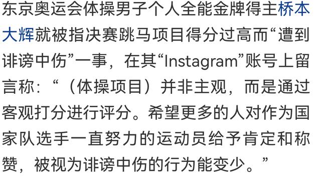 桥本大辉竟然这样回应跳马分数,他在其“Instagram”账号称:“并非主观,而是通过客观打分进行评分。希望更多的人对作为国家队选手一直努力的运动员给予肯定和称赞,被视为诽谤中伤的行为能变少。”