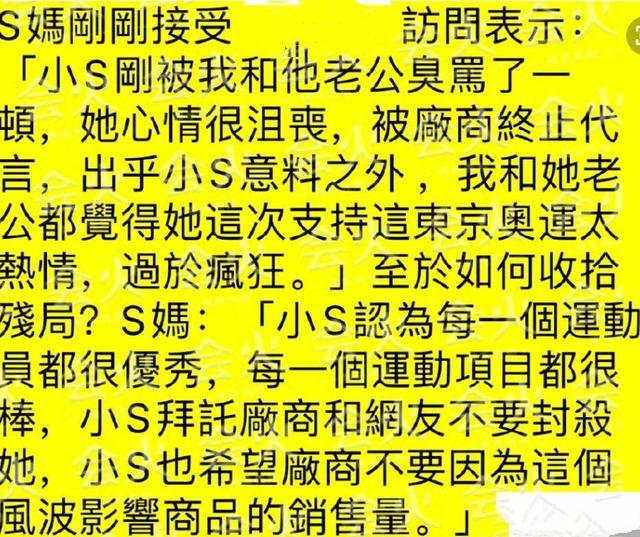 随后,小S妈妈接受采访,她表示小S的心情非常沮丧,尤其是被厂商终止代言合同后,更是出乎小S意料之外。