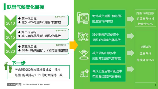 联想集团同时坚信,未来的增长要建筑在可持续发展的基础上。2021年,联想集团在实现上个十年减少92%温室气体排放的基础上,设立了新十年目标:到2030年,实现公司运营性直接及间接碳排放减少50%、部分价值链的碳排放强度降低25%。同时,联想还在积极评估,力争2050年达成温室气体净零排放,为全球控温做出更大贡献。
