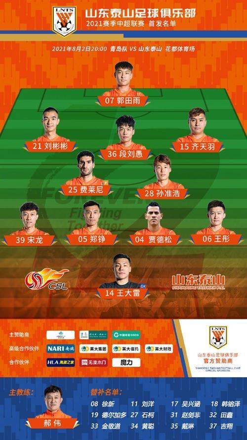 泰山两名U23球员郭田雨、段刘愚首次一起首发,两翼是刘彬彬、齐天羽,中路由两名强力外援费莱尼、孙准浩坐镇,新援贾德松继续首发,与郑铮搭档中后卫,石柯首次轮休。金敬道伤愈复出,替补席待命。