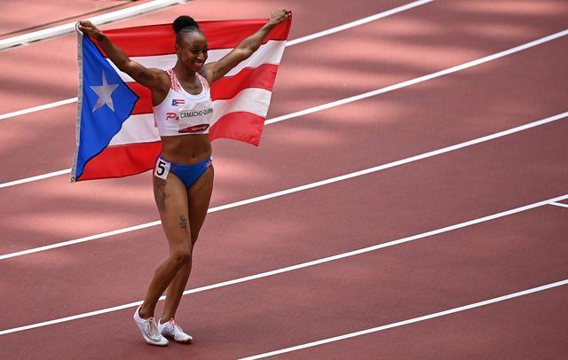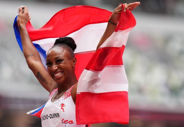 8月2日,波多黎各选手卡马乔·奎茵在女子100米栏决赛后庆祝。 新华社记者 吕小炜 摄