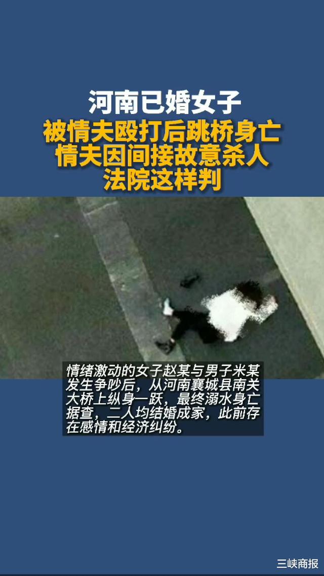 【摘要】 「本文来源:三峡商报」河南已婚女子被情夫殴打后跳桥身亡,情夫因间接故意杀人一审获刑5年河南已婚女子被情夫殴打后跳桥身亡,情夫因间接