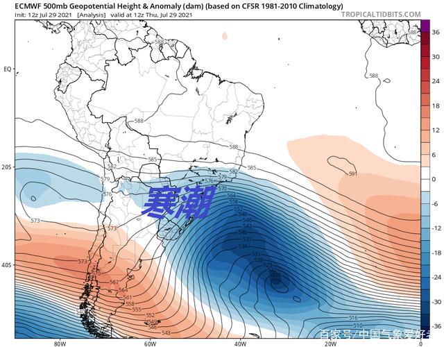 而从高层的情况看,南半球的西风带在7月28-7月29日前后出现了一次剧烈波动,在南大西洋上形成了一道强盛的深槽,正是这道深槽拉动巨量南极极寒气团逸出南极圈,席卷了巴西等地。