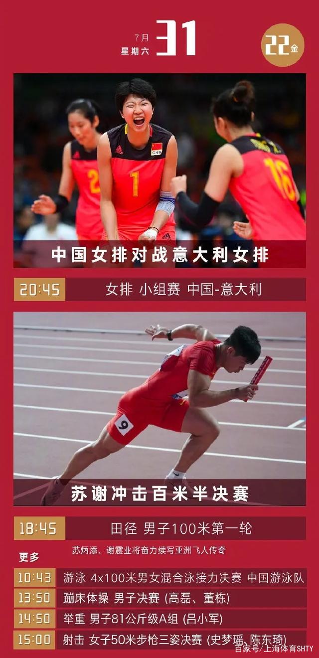 对阵意大利,中国女排迎小组生死战。苏炳添、谢震业冲击田径男子100米半决赛。