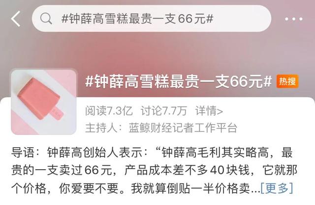 热度最高的国产品牌要属钟薛高,它从网络营销中崛起,其旗下产品的官方售价,从16元/片到高达88元/盒均有。钟薛高就曾因“雪糕最贵一支66元”的话题登上微博热搜第一。