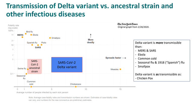 图片的横轴是平均感染的人数,从图片上看,德尔塔的变种(蓝色框)平均感染的人数,是SARS的两三倍。