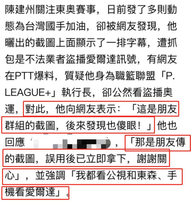 被网友抓包以后,陈建州极力地为自己辩解,称“这是朋友群组的照片,误用后已拿下,谢谢关心”,并强调自己都是在看正版的奥运赛事。