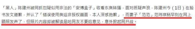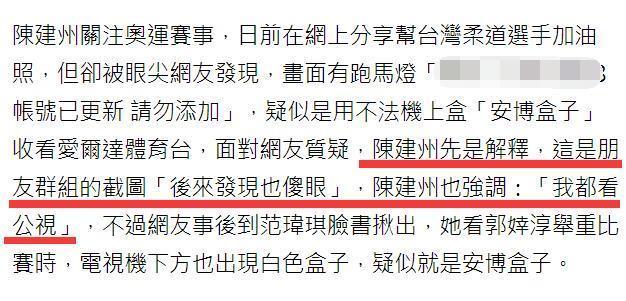 一起来看看台媒的报道标题“陈建州否认用安博盒子(机顶盒),范玮琪失手拍到成铁证”,之后,陈建州认了使用机顶盒看奥运,并为看盗版奥运深感抱歉。