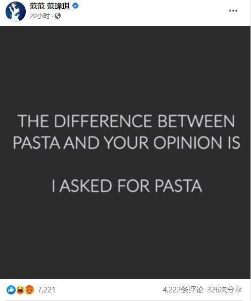 陈建州已经主动道歉,不过一开始范玮琪在脸书上晒出一条动态,说:“The difference between pasta and your opinion is i asked for pasta。(意大利面和你的意见的区别是,我要的是意大利面)”。范玮琪的这条动态被网友解读为不要给意见,更引起不少网友的不满。