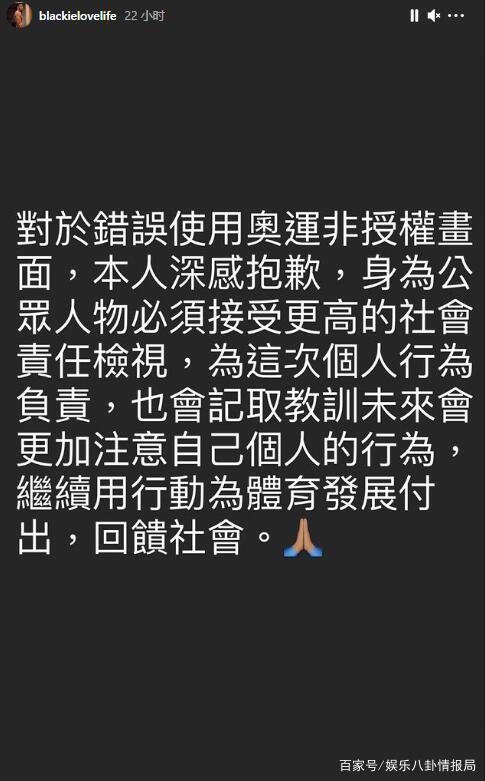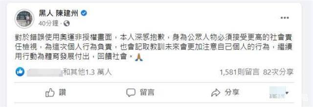 随后,陈建州只能承认自己使用非授权的画面观看奥运,在社交平台发文:“本人深感抱歉,身为公众人物必须接受更高的社会责任,为这次个人行为道歉,谨记教训,更加注意自己的个人行为”。