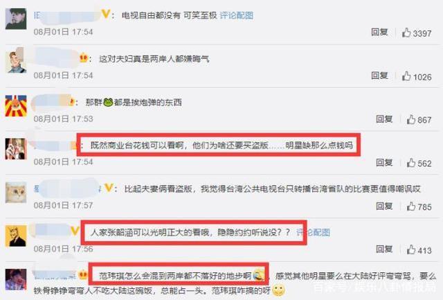 看到范玮琪陈建州夫妇的这一波操作,网友纷纷吐槽:“既然商业台花钱可以看啊,他们为啥还要买盗版……明星缺那么点钱吗”,“人家张韶涵可以光明正大的看哦,隐隐约约听说没?”“他们两个好像不是第一次干这种事了吧,红的时候也挣了不少钱,能不能不干这种丢人事了,又爱晒”。