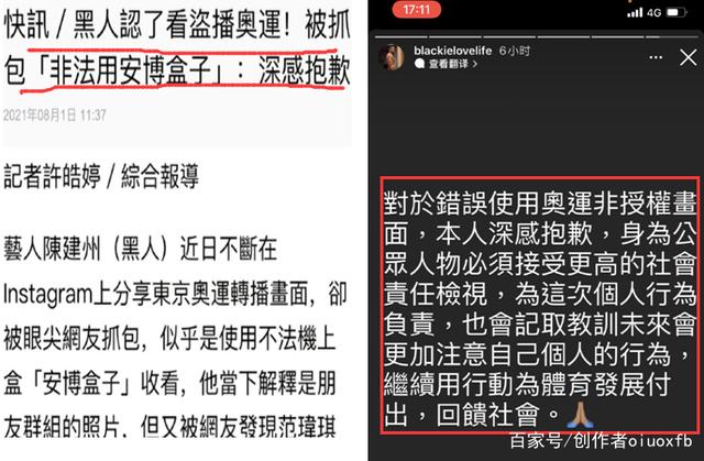 面对网友们的攻击,黑人陈建州一开始还是比较嘴硬表示这是在朋友群里看到后转存的照片,并不是自己家电视转播拍摄的。不过,万能的网友们很快又用现实戳破陈建州的谎言。原来,有网友发现范玮琪曾不久前发过家里的照片,在其中一张照片上可以很清楚的看到他们家里有安装类似盗版机顶盒“安博盒子”。因此,面对这一明晃晃的铁证,陈建州不得不低下头,在网上重新发文,为自己的错误行为向大家道歉,并虔诚表示“作为公众艺人必须要接受这种更高的社会责任监督,会吸取教训,并用行动改正错误,继续支持体育事业的发展”。
