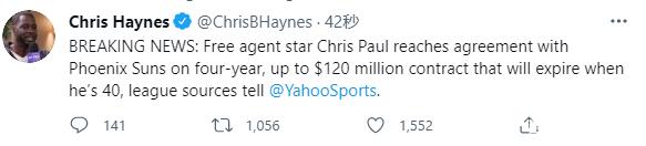 北京时间8月3日,NBA自由球员交易市场正式开启,36岁的保罗继续留在太阳,据名记海耶斯报道,保罗已经和太阳达成续约合同,双方签约4年1.2亿美元大合同,合同将在他40岁时到期,新赛季保罗继续联手布克冲击总冠军。
