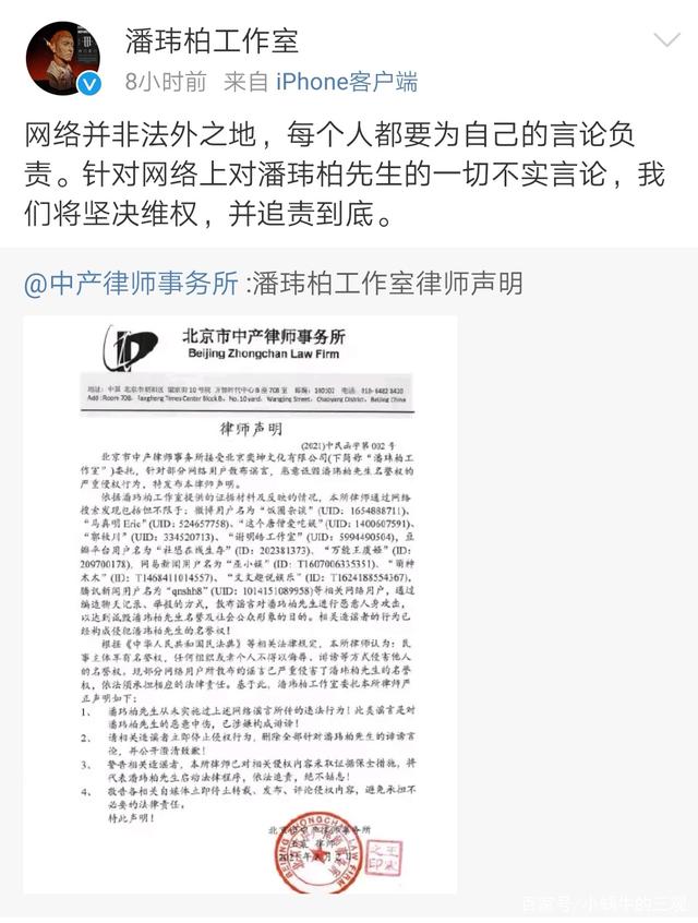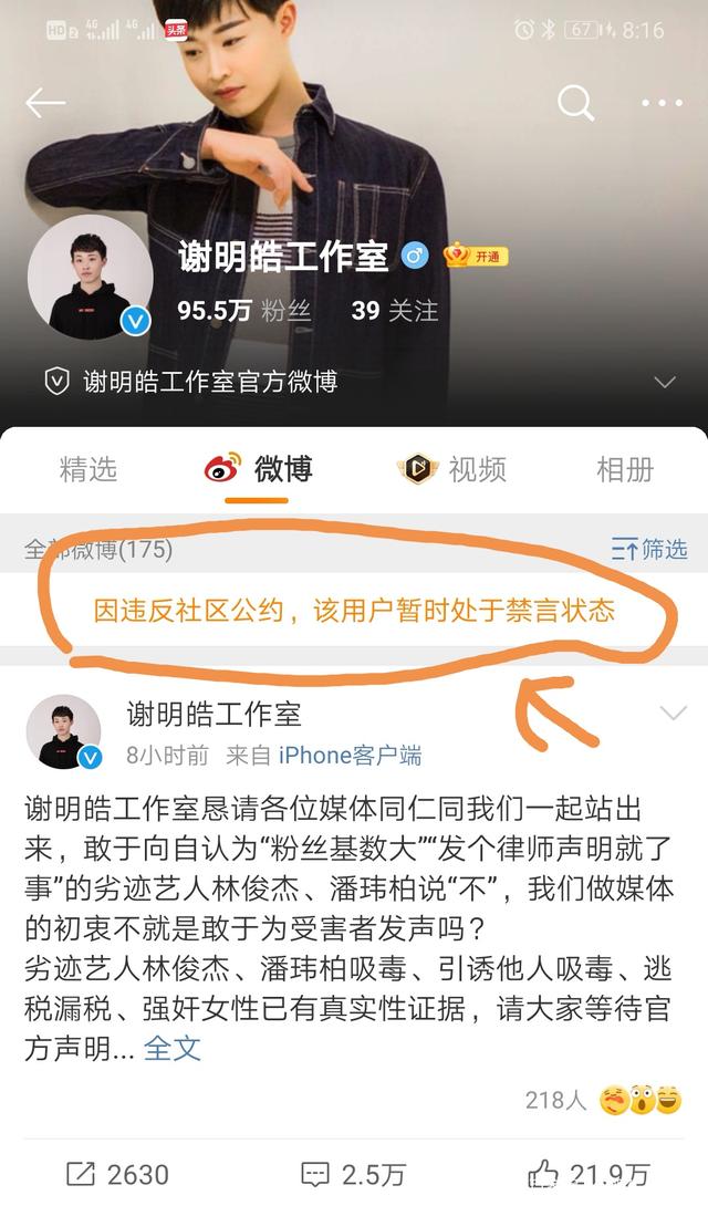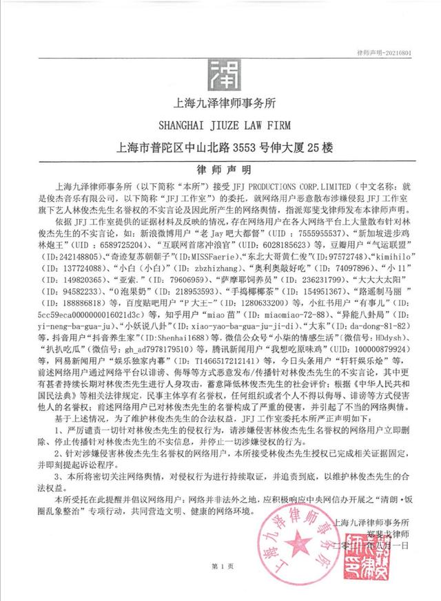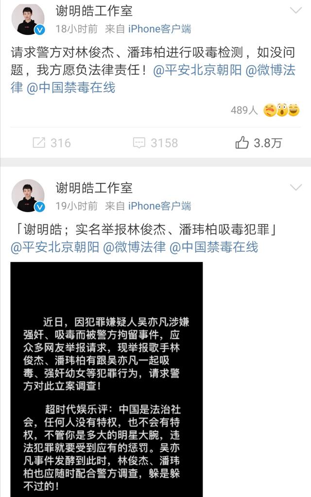 就在谢明皓发布微博实名举报不久,林俊杰、潘玮柏工作室也相继发布律师函!声明网络不是法外之地,每个人都要对自己的行为负责!并要求那些传播不实言论的作者删除相关言论!