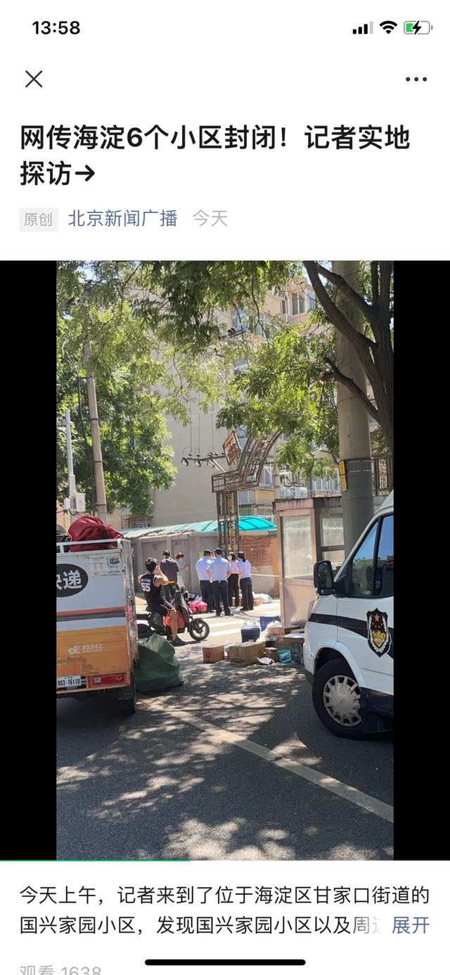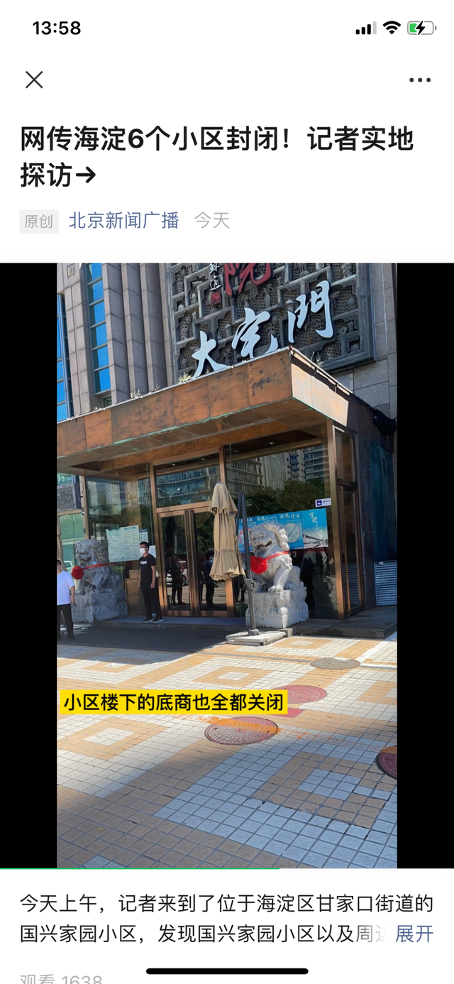 今天上午,记者来到了位于海淀区甘家口街道的国兴家园小区,发现国兴家园小区以及周边的5号院小区,赏竹阁小区,市政小区,新疆办事处家属院以及新苑街10号院,共6个小区都实行了封闭管控。
