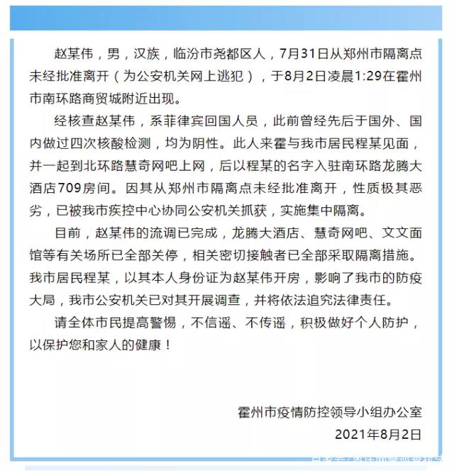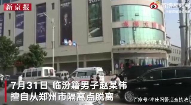 7月31日,山西临汾籍男子赵某伟擅自从河南郑州市隔离点脱离。8月2日,从山西临汾霍州市新冠肺炎疫情防控工作领导小组获悉,该男子为公安机关网上逃犯,系菲律宾回国人员,目前已被该市疾控中心协同公安机关抓获,实施集中隔离。霍州市公安机关已对其展开调查,并将依法追究法律责任。