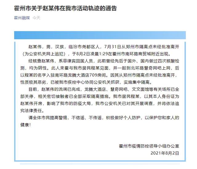 网传图片显示,外逃男子名为赵某伟,山西省临汾市尧都区柴里村人。该紧急通知称,赵某伟7月31日从郑州市隔离点外逃,8月1日在晋城市沁水县公安局附近出现,2日凌晨又出现在山西霍州市南环路商贸城附近。通知还表示,经核查,目前赵某伟已返回临汾市。