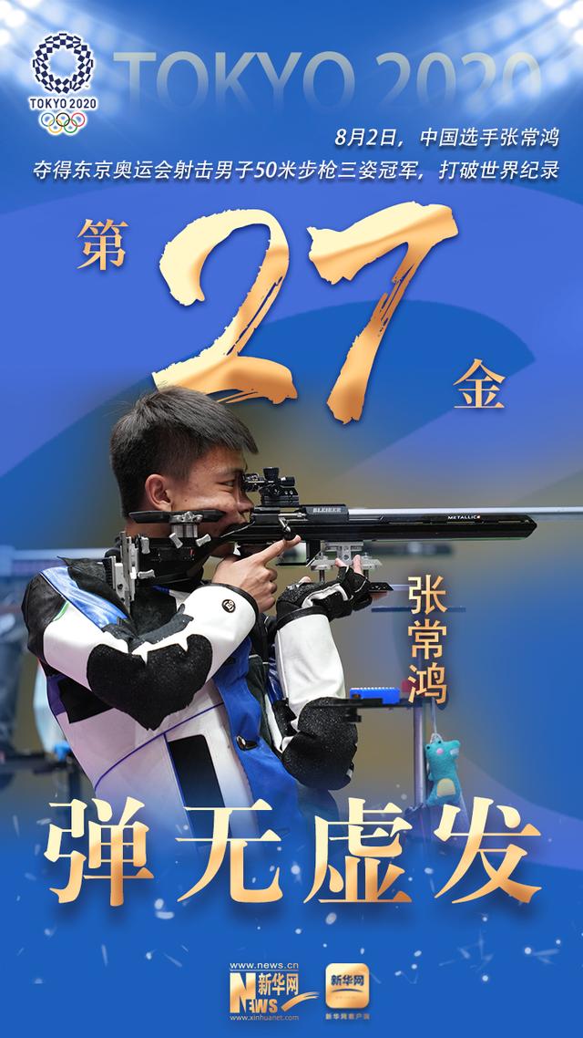 十多分钟后,第27枚金牌从射击场射落。在射击男子50米步枪三姿决赛中,21岁的张常鸿以466环的成绩打破世界纪录、奥运会并夺冠。随着这枚金牌花落中国代表团,本届奥运会的射击项目也结束了所有比赛争夺,在本届奥运会中,中国射击队一共获得了4金1银6铜,表现出色。