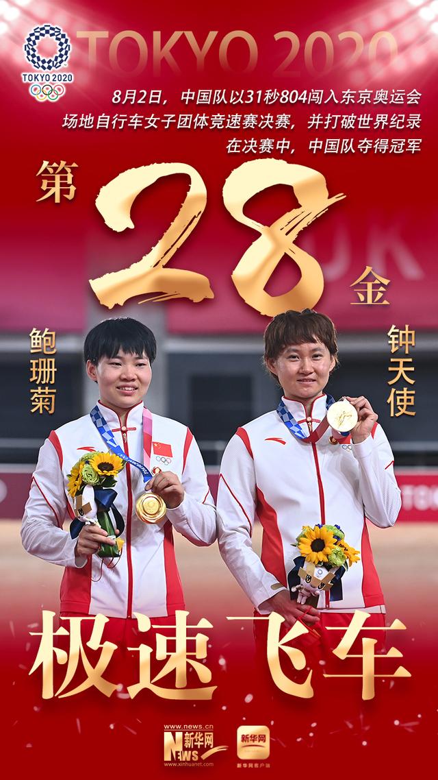 第四枚金牌来自场地自行车女子团体争先赛决赛中,钟天使/鲍珊菊击败德国搭档,为中国代表团收获第28金。场地自行车是近年来中国代表团的优势项目之一,在上届奥运会上,中国代表团就在这个项目上取得了场地自行车奥运金牌零的突破。