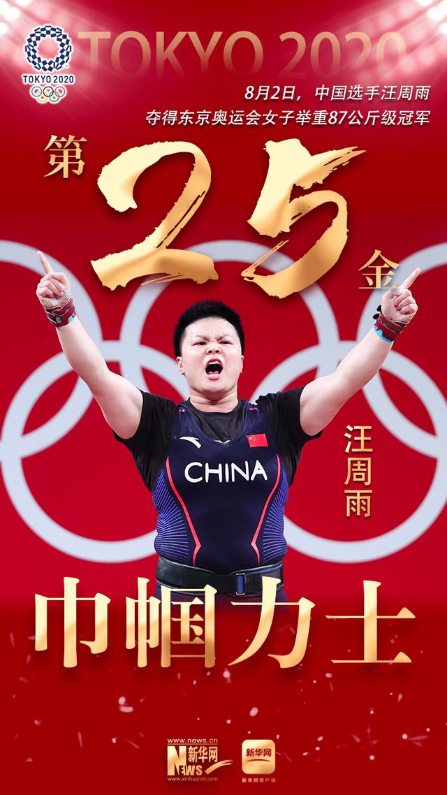 中国代表团当天的首枚金牌来自举重赛场,女子举重87公斤级比赛中,汪周雨以总成绩270公斤夺冠,这也是中国举重队在东京的第6枚金牌,创历届奥运会最佳战绩。