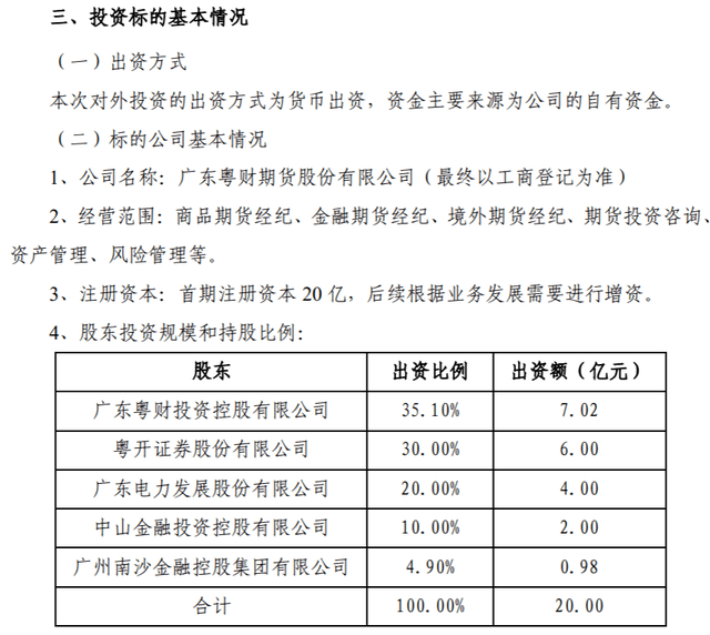 粤电力A称,该公司董事会同意以自有资金4亿元、按照20%股权比例参与发起设立广东粤财期货股份有限公司(最终以工商登记为准,简称“省属期货公司”),并签署省属期货公司的发起人协议和公司章程。