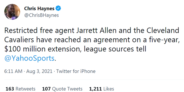 根据Shams报道,消息人士透露,贾莱特-阿伦5年1亿美元续约骑士。阿伦,在上赛季被篮网队交易至了骑士队。送走阿伦之后,篮网队的内线攻防实力出现了大幅度下滑。在阿尔德里奇赛季中期宣布退役的情况下,篮网队的在内线的轮换显得捉襟见肘,这是他们在东部半决赛难敌雄鹿队的主因。